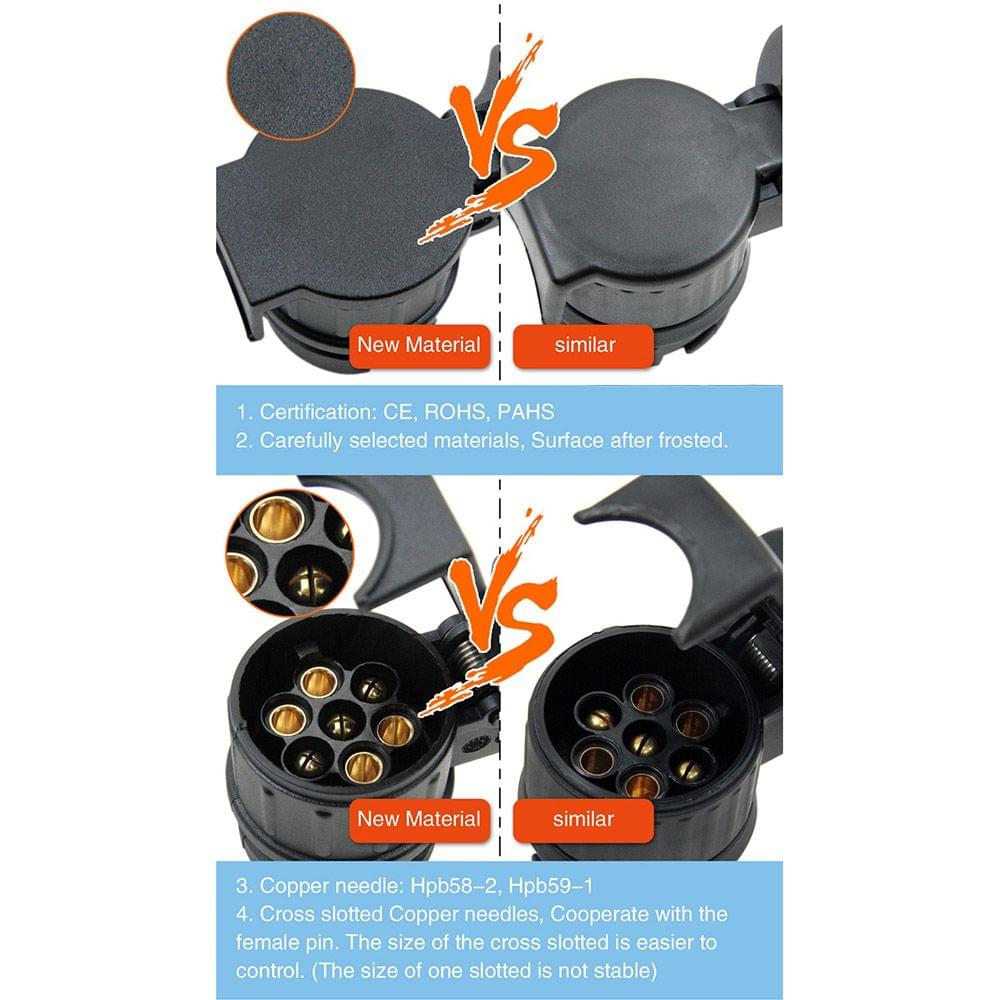 Features:Suitable for European standard trailer.Establishes a secure connection between your major vehicle and the additional trailer; Transfers the electronic signal lights from the vehicle to trailer.Converts the 13-pin socket on your car to the 7-pin female socket.Supplies power to your caravan towing and truck.Slim line design: same diameter as a normal trailer plug and just over half the length.Plastic housing prevents rusting and enhances appearance.Waterproof for all road and weather conditions.Specifications:Item Type: Electrical Plug SocketsItem Name: 13 To 7 Pin AdapterMaterial: PlasticColor: BlackInput: 12VItem size: 4(D) * 7(H)cm / 1.6(D) * 2.8(D)inPackage size: 16.5 * 10.5 * 5cm / 6.5 * 4.1 * 2.0inPackage weight: 95g / 3.4ozWiring configuration:7 Pin Lighting Connections - 12 N Black Cable Function Pin Wire Color Function 1 Yellow L / H Direction Indicator 2 Blue Rear Fog Lamps 3 White Earth Return 4 Green R / H Direction Indicator 5 Brown R / H Tail No. Plate Lamp 6 Red Stop Lamps 7 Black L / H Tail No. Plate Lamp 13 Pin Lighting Connections - Cable Function Pin Wire Color Function 1 Yellow Left Indicator 2 Blue Fog Light 3 White Earth Return 4 Green Right Indicator 5 Brown Right tail / Side Light 6 Red Brake / Stop Lights 7 Black Left tail / Side Light 8 Pink Reversing Light 9 Orange 12V Permanent power from battery 10 Grey 12V Ignition on (Battery charging or Fridge) 11 White / Black Earth for Teminal 10 12 White / Blue NOT usually used 13 White / Red Earth for Teminal 9 Package List:1 * 13 To 7 Pin Adapter