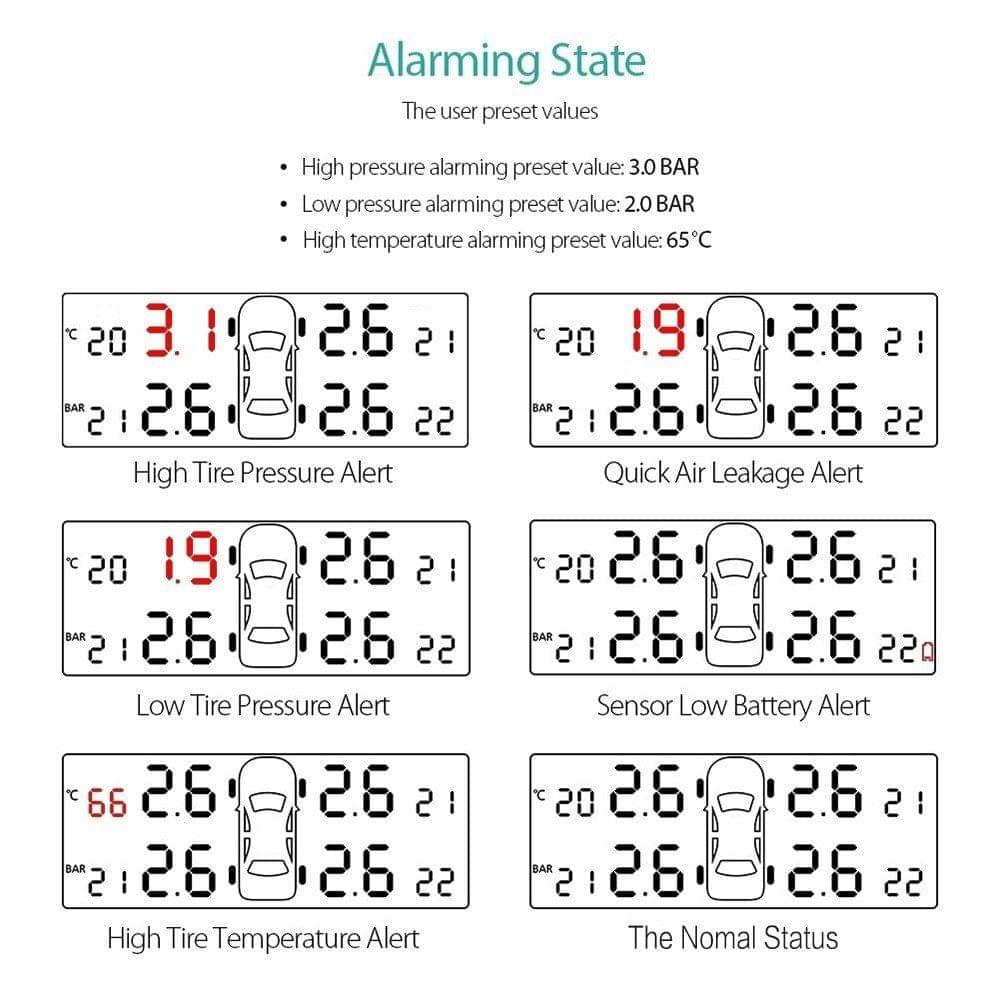 description":"Features: Real-time Monitoring: LCD display shows the pressure and temperature of 4 tires simultaneously, letting you get real-time information about the tire condition. Two Charge Methods: Tire pressure monitoring system is combined with the solar energy panel, quickly charge, also support USB charge (USB cable is not included). Intelligent Alarm: Once there is an abnormal status, a warning happens, such as leakage alert, high temperature alert, high pressure alert, low pressure alert. LCD Digital Screen: Bright backlist for clear readings; Pressure unit is BAR/PSI, and temperature unit is ?/?, all real-time data of car tires is clear at a glance. Effective Protection: 4 high sensitive sensors has waterproof and anti-corrosion, anti -theft features, there is no worry even in rainy days, ensuring your driving safety. Specification: Monitor: Display screen: LCD Operating temperature: -20? ~ 80? Working voltage: 3.5-4.2V Daytime operating current/Night operating current/Standby current:?20mA/?4mA/?50uA Transmission frequency: 433.92MHZ+/-20KHZ Transmission mode: FSK Pressure unit: BAR/PSI Charging ways: Solar energy/USB (USB cable is not included) Battery: 1 * 402040 3.7V 300mAh Monitor size: Approx.9.5*3*1.5cm Monitor weight(with solar panel): Approx.71g Sensor: Operating temperature: - 20? ~ 80? Working voltage: 2-3.6V Standby current:?1uA Transmission frequency: 433.92MHZ+/-20KHZ Transmitted power:?8dBm Open Distance:?30M Battery (each sensor): 1 * CR1632 3V Sensor size (each): Approx.2*2*2cm Sensor weight (each): Approx.8g Package Size: 21*15*6cm / 8.27*5.91*2.36in. Package Weight: 233g / 8.22oz Package List: 1 * Displayer 4 * External Sensors 1 * Wrench 4 * Nut 1 * User Manual(English)
