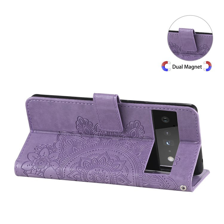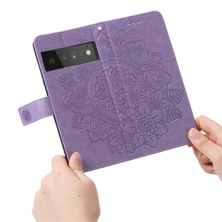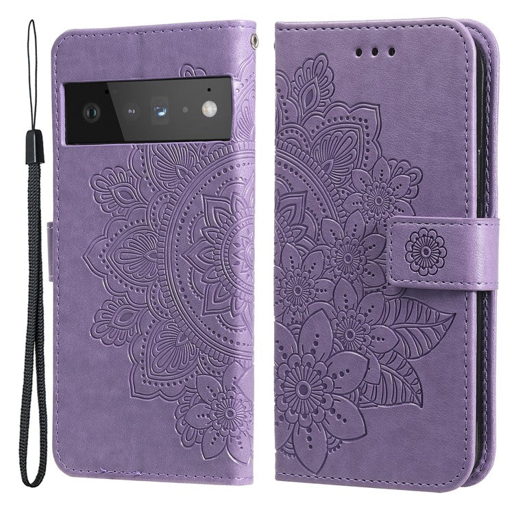 TPU+PU Leather Phone Case Stand Practical Flip Shell Card Slots Imprinted Flower Pattern Wallet Cover with Lanyard for Google Pixel 6 Pro - Light Purple