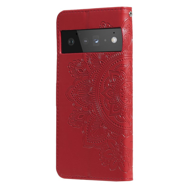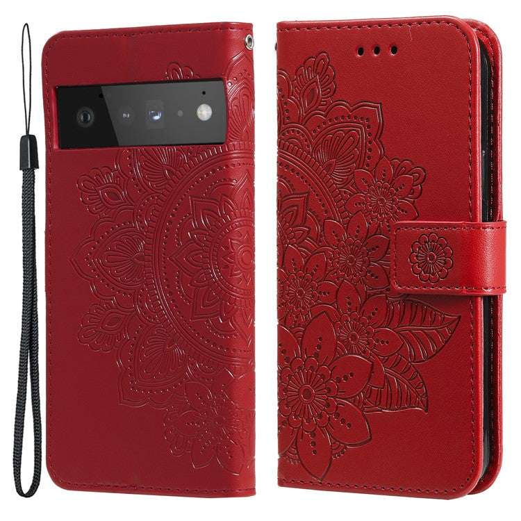 TPU+PU Leather Phone Case Stand Practical Flip Shell Card Slots Imprinted Flower Pattern Wallet Cover with Lanyard for Google Pixel 6 Pro - Red