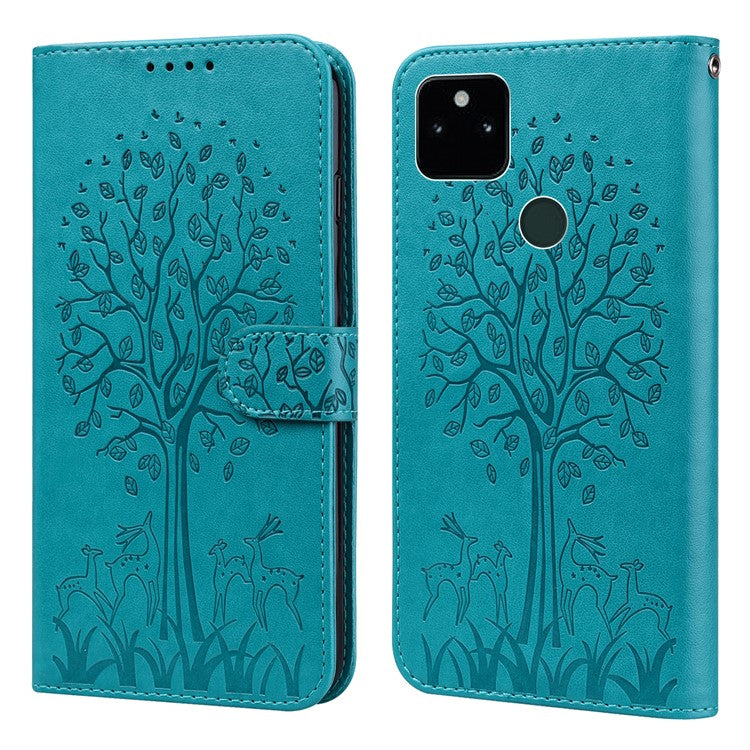 Tree and Deer Imprinted Wallet Stand Design All-round Protection Double-sided Magnetic Clasp Leather Phone Shell Case for Google Pixel 5a 5G - Blue