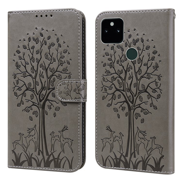 Tree and Deer Imprinted Wallet Stand Design All-round Protection Double-sided Magnetic Clasp Leather Phone Shell Case for Google Pixel 5a 5G - Grey