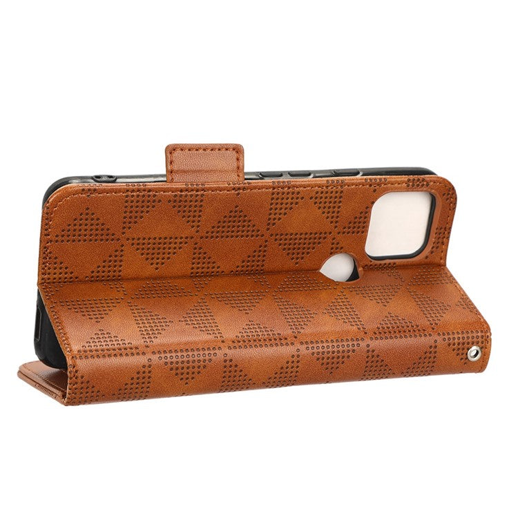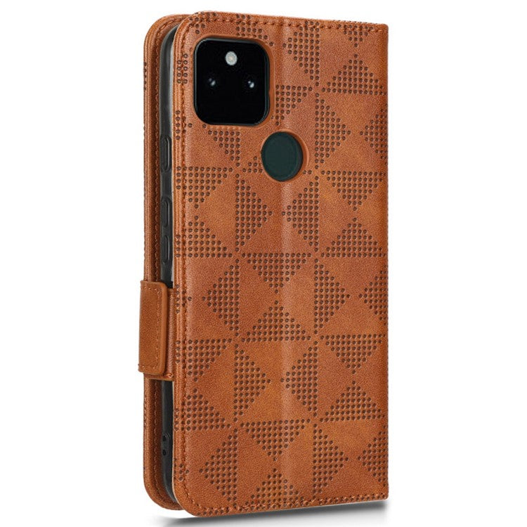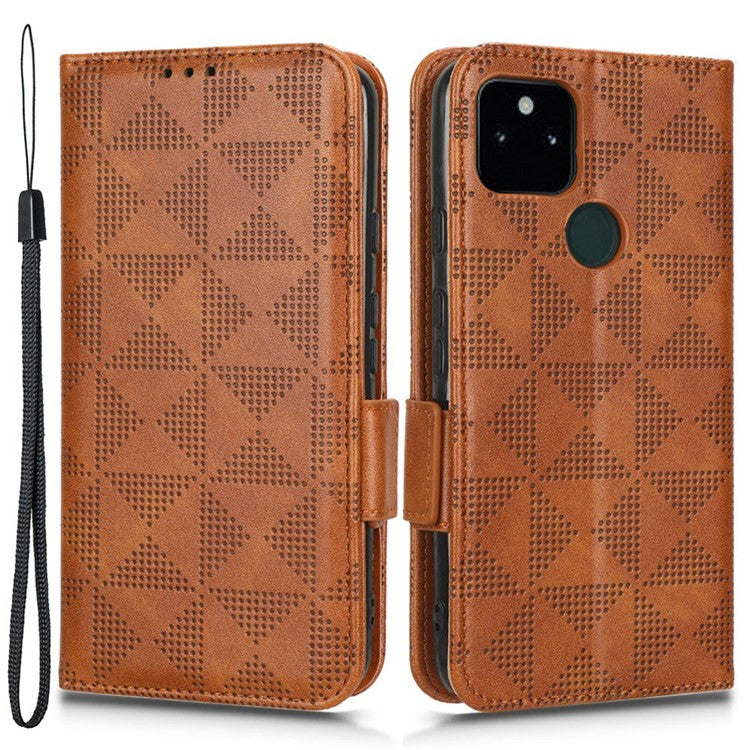 Triangle Pattern Imprinted Phone Case for Google Pixel 5a 5G Anti-scratch Folio Flip Cover PU Leather Wallet Stand Case with Strap - Brown