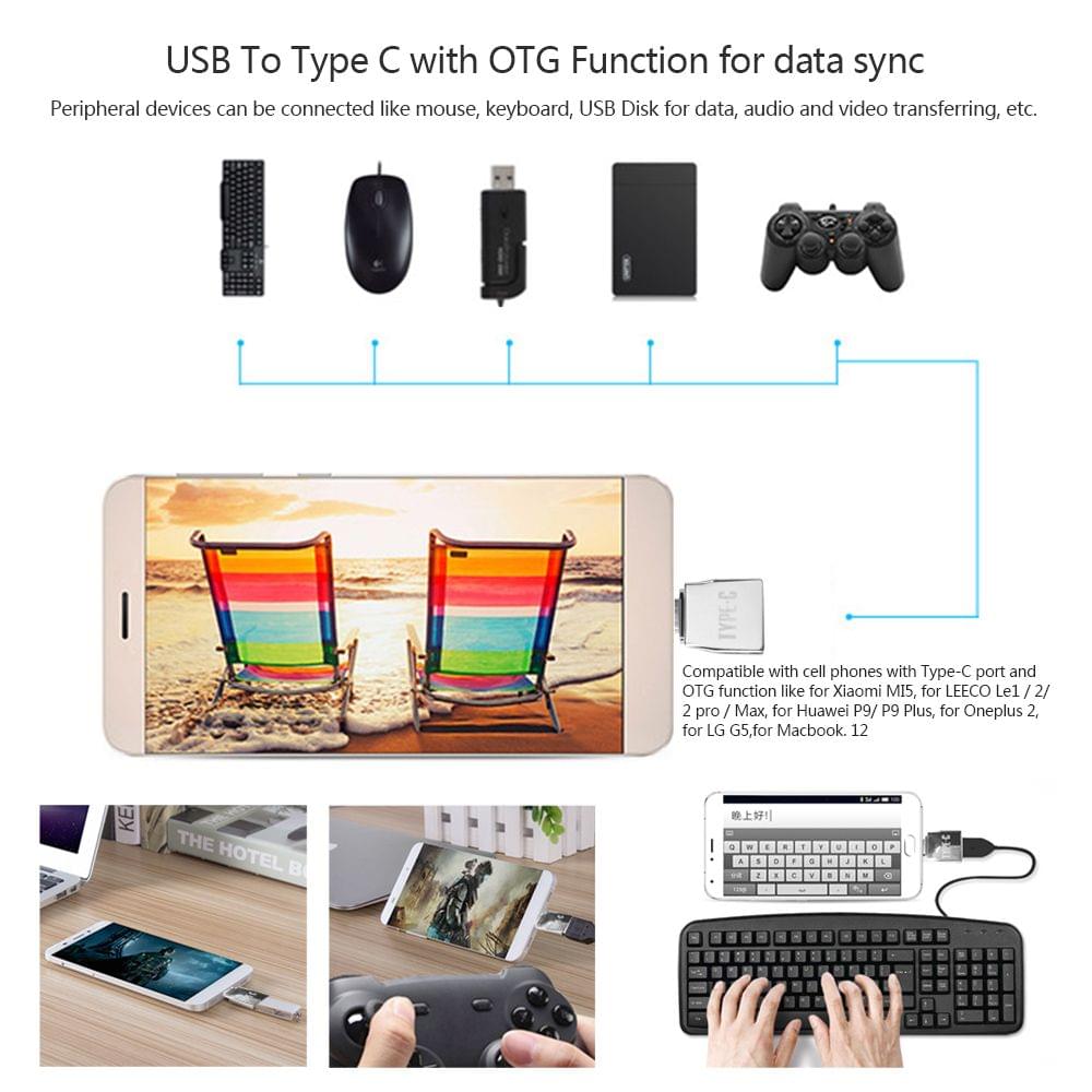 Type-C Adapter Kit combines Micro USB to Type C Adapter and USB to Type-C. Micro USB to Type C is for charging function and USB to Type C with OTG function is for data sync.Features:[Type-C Adapter Kit]The first adapter is Micro USB to Type C for charging function. The second adapter is USB to Type C with OTG Function for data sync.[Peripheral Devices Connection]Peripheral devices can be connected like mouse keyboard USB Disk for data audio and video transferring etc.[Strong Compatibility]Compatible with cell phones with Type-C port and OTG function like for Xiaomi MI5 for LEECO Le1 / 2/2 pro / Max for Huawei P9/ P9 Plus for Oneplus 2 for LG G5 for Macbook.[Anti-lost Function]Anti-lost buckle allows you to hold it on the key chain.[Plug and Play]Plug and play support positive and negative insertion simple operation.Specification:Adapter 1: Micro USB to Type CAdapter 2: USB To Type C OTG FunctionFunction: Data Sync Charging AdapterAdapter 1 Size: Approx. 1.9 * 1 * 0.5cm / 0.75 * 0.39 * 0.20inAdapter 1 Weight: Approx. 6.2g / 0.21ozAdapter 2 Size: Approx. 2.3 * 1.5 * 0.8cm / 0.91 * 0.59 * 0.31inAdapter 2 Weight: Approx.5.6g / 0.19ozPackage Size: Approx. 11.3 * 6.7 * 0.1cm / 4.45 * 2.64 * 0.04inPackage Weight: Approx. 18g / 0.64ozPackage List:1 * Type-C Adapter Kit