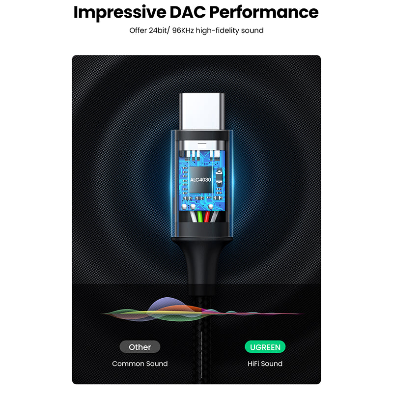 - Stunning DAC Performance: UGREEN Type C to Headphone Jack Adapter adopts an advanced DAC(digital-to-analog converter)chip to achieve 24bit/96kHz audio output capacity, improve the signal-to-noise ratio, decrease frequency range rata and maintain original sound quality. The USB C to Aux Earphone Cable lets you enjoy no-loss, noise-free, high-fidelity audio on headphones, home Hi-Fi system, car stereo radio, soundbar