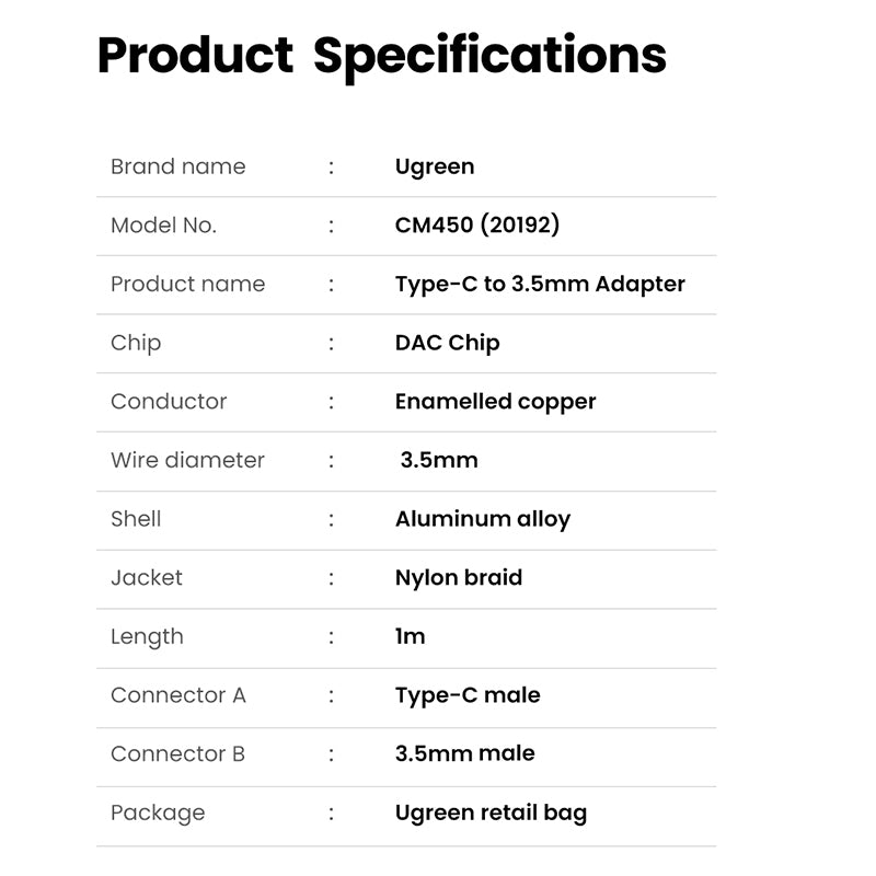 - Enhanced Durability: UGREEN USB C to 3.5mm Headphone Jack Cable is built to last longer. Combined nylon braided jacket with reinforced wire joints, the USB C to 3.5mm Jack Cable is robust enough to withstand any twist, tug, and tangle. Plus, the aluminum alloy shells and metal plugs can resist oxidation & corrosion. High-quality materials not only improve the durability of this USB-C Audio Adapter but greatly enhance its sound quality