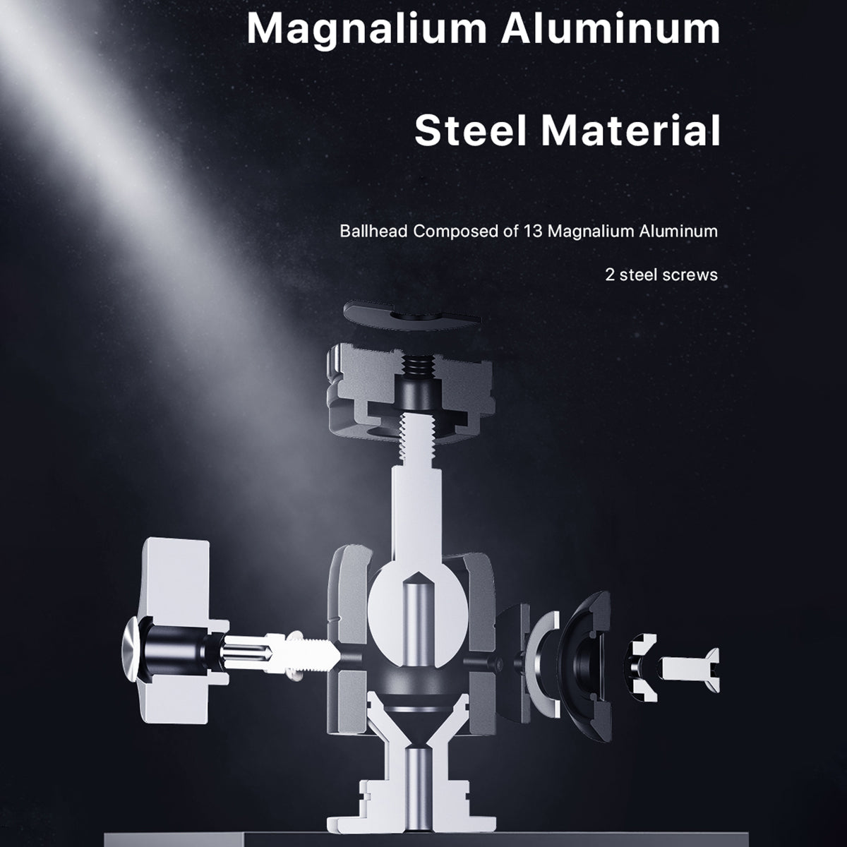 Magnalium Aluminum + Steel Material: Ball head composed of 13 magnalium aluminum parts + 2 steel screws