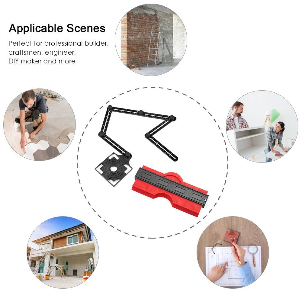 Create a custom stencil for your job, slide the 6-sided universal ruler into any desired angles, use the profile gauge ruler to replicate any curve, angle, or other awkward area