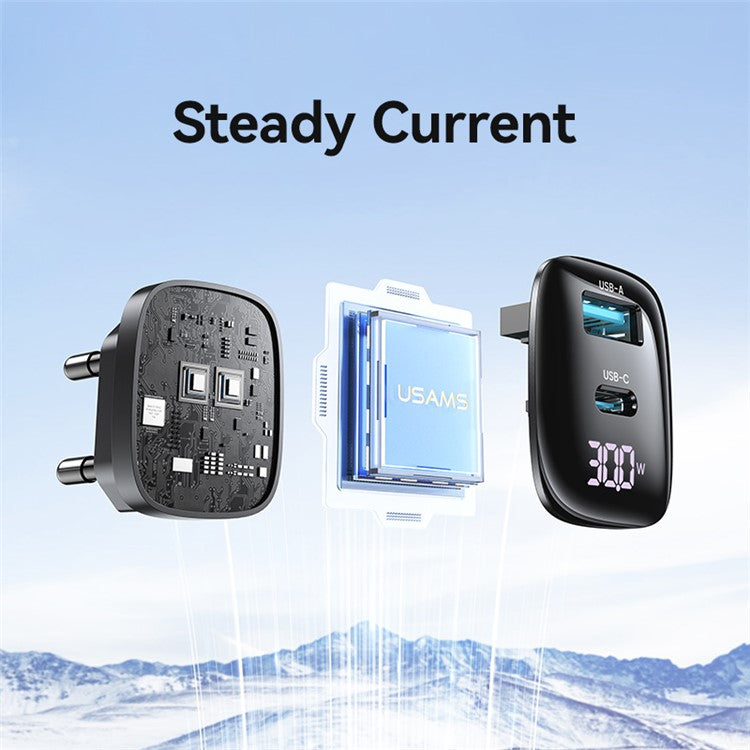 USAMS CC229 30W GaN Adapter USB-C+USB-C Dual Port Charger Block Real-Time Digital Display, EU Plug - White