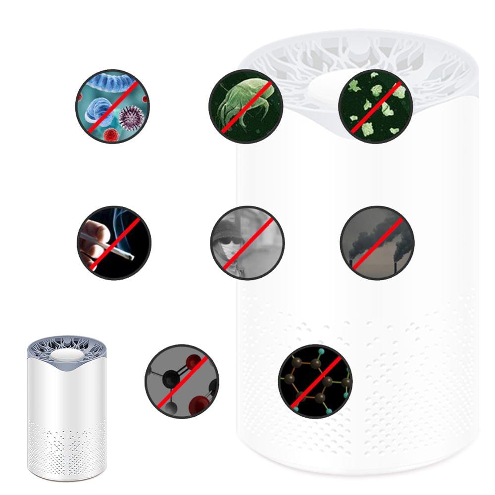 Features:LED Ultraviolet Cleaning: uses LED ultraviolet to produce a specific wavelength(260nm~280nm) that has strong UV intensity to kill up to 99.9 percent of unwanted substance.Practical Multifunction: air purifier air cleaner 2-in-1 it works well in killing mites and harmful substance removing pollen smokes and dusts and even eliminating odours and other unpleasant smells.Safety Operation: compared with regular UV lamp this automatic circulation air purifier working in the closure design no more worrying about ultraviolet radiation.5-in-1 High-efficiency Filtration Design: double non-woven fabric+activated carbon cotton+filter cotton+ultraviolet light multiple layers to filter out harmful substance thoroughly and efficiently.Simple Operation Low Noise: easily powered USB interface plug and play suitable for home office car hotel school and many other places.Specifications:Material: ABSRated Voltage: 5VRated Power: 5WRated Frequency: 50HzWavelength: 265nmParticle CADR: 60m3/hParticle CCM: P4Formaldehyde CADR: 45m3/hFormaldehyde CCM: F4TVOC: 40m3/hMethylbenzene: 40m3/hNoise: 35dB(A)Cable Length: 1mItem Size: 180 * 118mm / 7.09 * 4.65inPackage Weight: 500g / 17.64ozPackage Size: 19 * 13 * 13cm / 7.48 * 5.12 * 5.12inPacking List:1 * Air Purifier1 * USB Cable