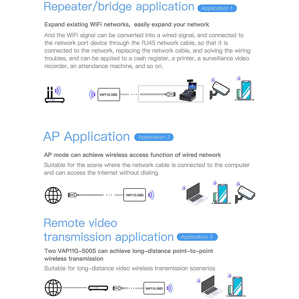 - [Industrial WiFi Bridge/Router/Repeater] The industrial mini 2.4GHz high-power WiFi bridge adopts the three in one technology: professional wifi router, wifi bridge, wifi repeater, which can realize the WiFi to wired or wired to WiFi function (WiFi to Ethernet) or Ethernet to WiFi conversion)