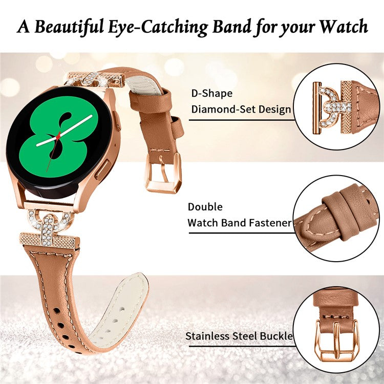 Watch Band for Samsung Galaxy Watch6 40mm 44mm / Watch6 Classic 43mm 47mm / Watch 5 40mm 44mm / Watch4 40mm 44mm , Rhinestone Decor 20mm Genuine Cow Leather Strap with Rose Gold Buckle - Brown