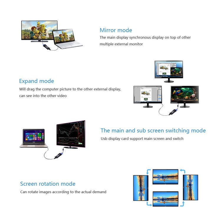 - Supports four display modes: screen extension, screen mirror, main and sub screen switching, screen rotation