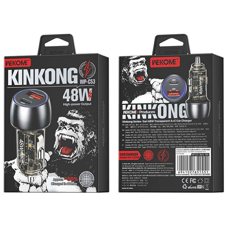 WEKOME WP-C53 48W Car Charger Aluminum Alloy + Transparent PC Shell Dual USB A+C Port Fast Charging Adapter - Black