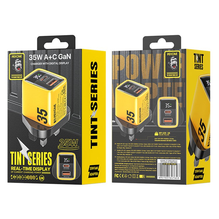 WEKOME WP-U25 35W GaN Charger Dual Port Fast Wall Charger Digital Display Adapter, UK Plug - Yellow