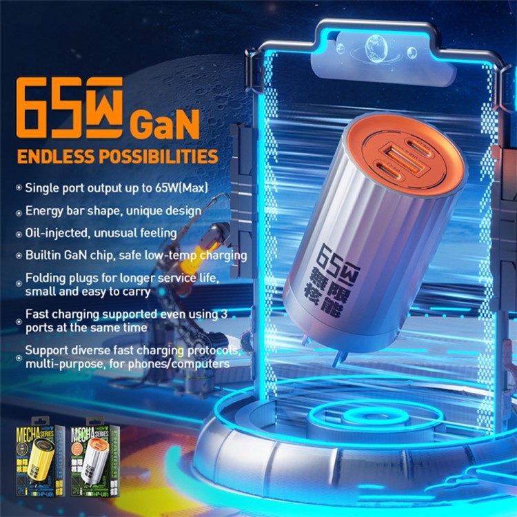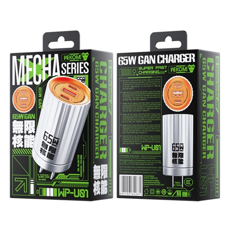 WEKOME WP-UO1 GaN 65W Fast Charger Energy Bar Design Dual USB-C+USB Wall Charger - Silver / CN Standard Plug