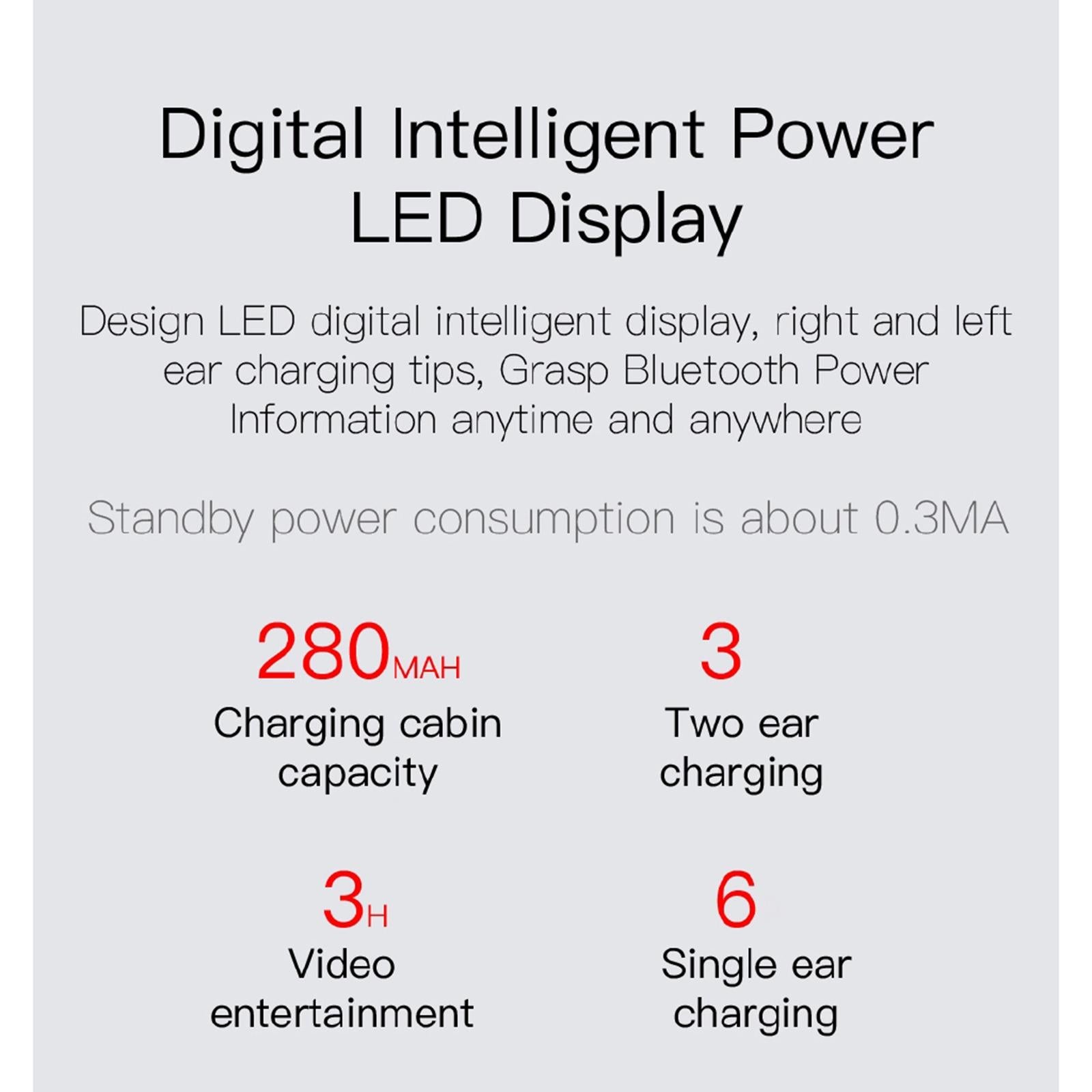LED Display: With charging box, easy to store and carry anywhere, LED digital intelligent diaplay, right and left ear charging tips, Grasp power information anytime and angwhere