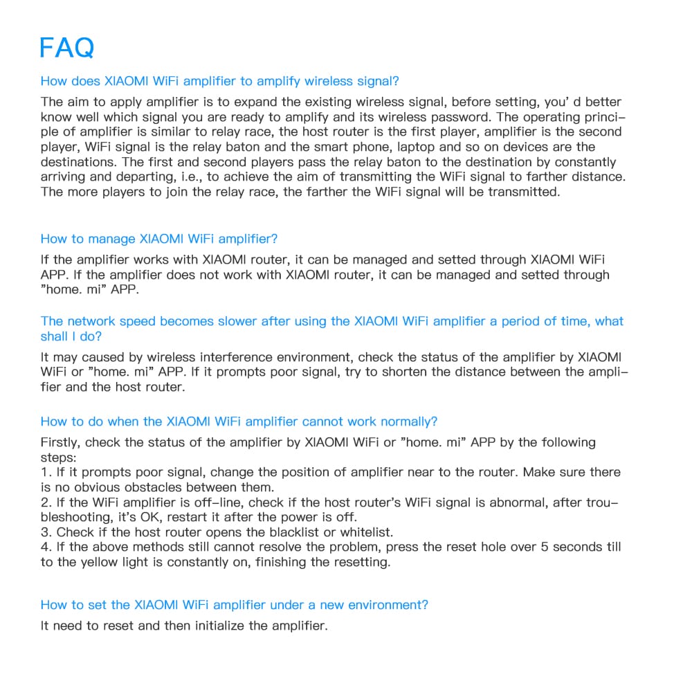 Xiaomi Mi WiFi Repeater Pro is designed to extended WiFi coverage and strength the signal by repeating the signal from your home or office wireless router and redistributing. With up to 300Mbps speed and built in dual antennas it eliminates WiFi dead zones and make you enjoy seamless HD streaming online gaming everywhere. It works with any standard WiFi router.Features:2 External AntennasDual external high gain antennas with transfer rate up to 300Mbps.Works with Most RouterExtends your WiFi and delivers reliable coverage compatible with most standard router or gateway.Wall-plug DesignConveniently to plug into any outlet for WiFi extension plug and play after the first setting.Auto-update It will update automatically without any tedious operation.Extends Wi-Fi CoverageSupport up to 64 devices connect at the same time stay connected from every corner.Specification:Brand: XiaomiColor: BlackInterface: USplugTransmission rate: 300MbpsAntenna: Built-inWiFi Network Frequency: 2.4GHzPower supply: 100-240VPackgae size: 15 * 10 * 8cm / 5.90 * 3.93 * 3.15in (L * W * H)Package weight: 125.00g / 4.40ozPackage list:1 * Repeater