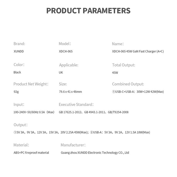 XUNDD XDCH-065 GaN Power Adapter Type-C+USB-A Dual Port 45W Fast Charging Block - UK Plug