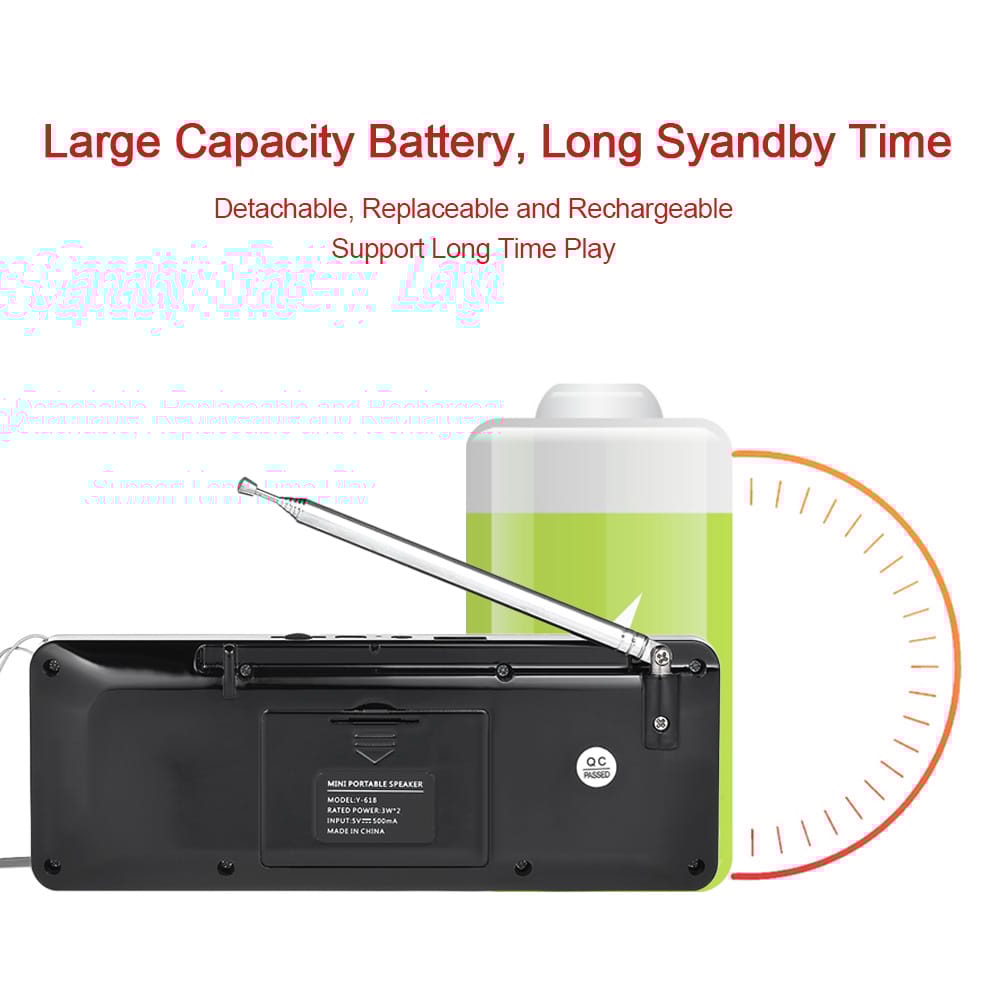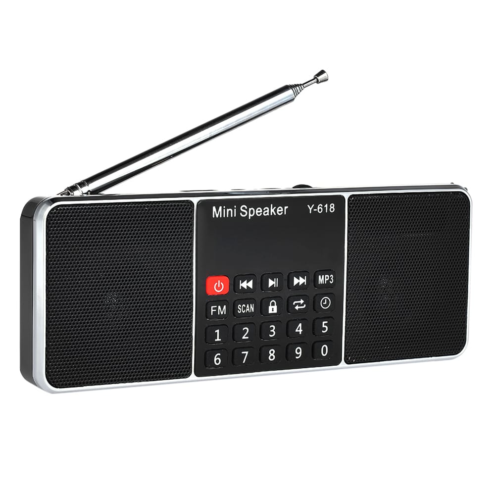 Y-618 Mini FM Radio Speaker is specially designed for people who are free to listen to radio weather and news at home. Loud sound and high fidelity sound quality makes you enjoy favorite music at anytime and anywhere. It is really cool and trendy to enjoy music with this multi-functional stereo digital speaker.Features:[FM Radio Speaker]With high quality FM Radio signal mini radio speaker can search channels automatically. Number buttons are for MP3 selection and FM Radio station easily. Direct manipulation and get started quickly.[High Fidelity Sound Quality]With dual 3W speakers loud sound and high fidelity sound quality is perfectly suitable for the aged. It's also available for earphones connected with 3.5mm earphone jack.[TF / SD Card U Drive]As a speaker it can play music from TF / SD card and U drive. In MP3 mode when powered off it can playback the current MP3 when powered on next time.[Convenience]With 2 inch diaplay screen and unique plastic buttons user-friendly durable and eco-friendly. Lanyard design is convenient for you to take outside. And the timed shutdown function helps you in daily life.[Endurance Time]Replaceable 1000mAh battery also can be charged via included Mini USB charging cable; large battery capacity supplies long standby time which gives you music enjoyment all the day.Specification:Model Number: Y-618Display Screen: 2 InchFM: 87.5 MHZ-108 MHZDecoding Range: 8-320 KbpsFrequency Range: 120 Hz-20 KHzDistortion: 1.5W=1% F=1 KHzOutput Power: 2 * 3W (max)Speaker Size: 40mm 16core internal magneticPower Input: DC 5V / 500mAOutput Impedance: 4ohmSNR: 87dBBattery Capacity: 1000mAhColor: BlackItem Size: Approx. 17.8 * 6.6 * 2.0 cm / 7.00 * 2.59 * 0.78 inItem Weight: Approx. 198 g / 6.98 ozPackage Size: Approx. 19.5 * 9.9 * 3.5 cm / 7.67 * 3.89 * 1.37 inPackage Weight: Approx. 291 g / 10.28 ozPackage List:1 * FM Radio Speaker1 * Mini USB Charging Cable1 * English User Manual
