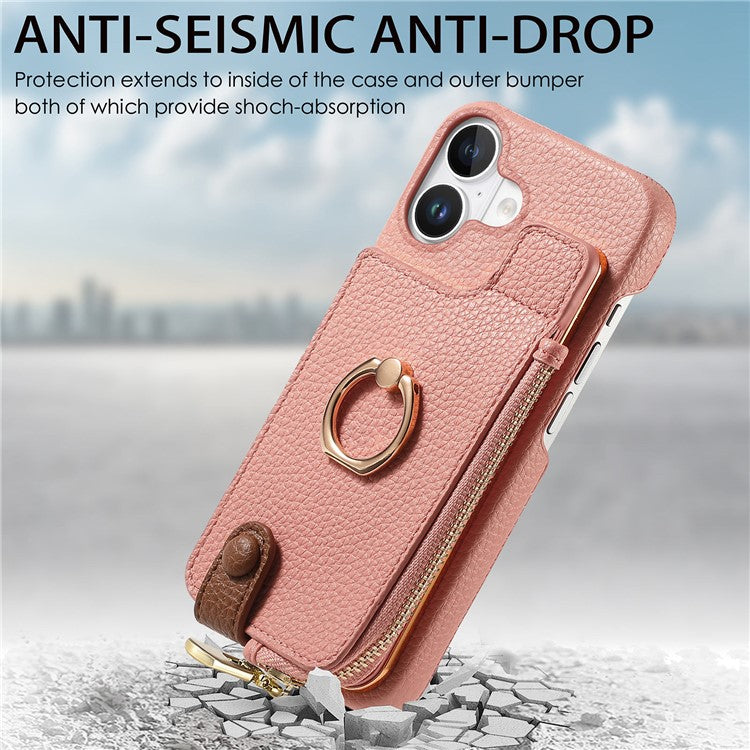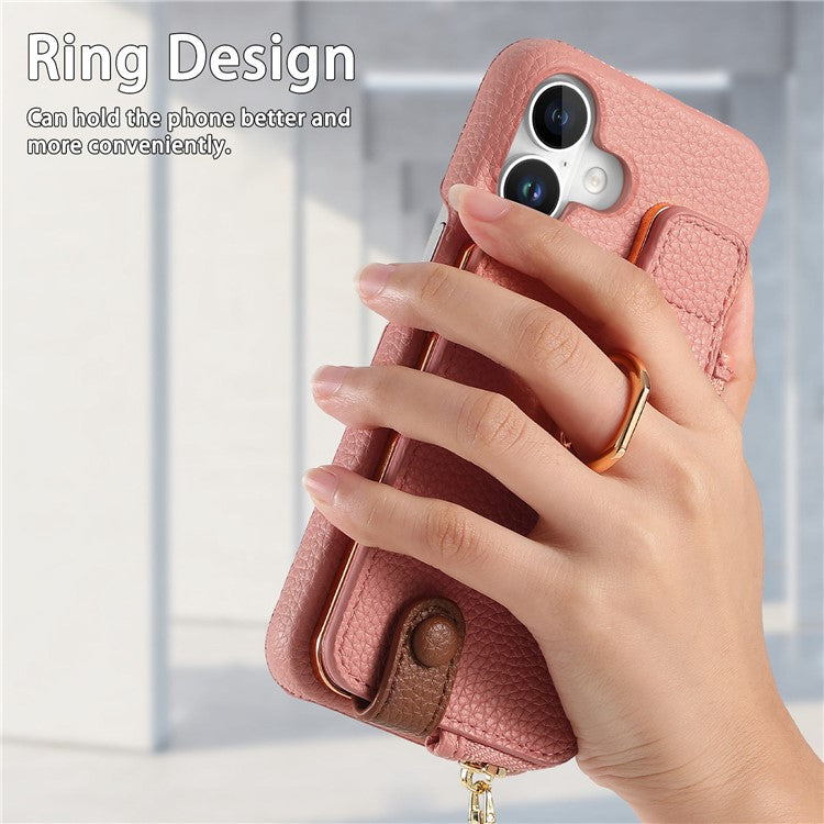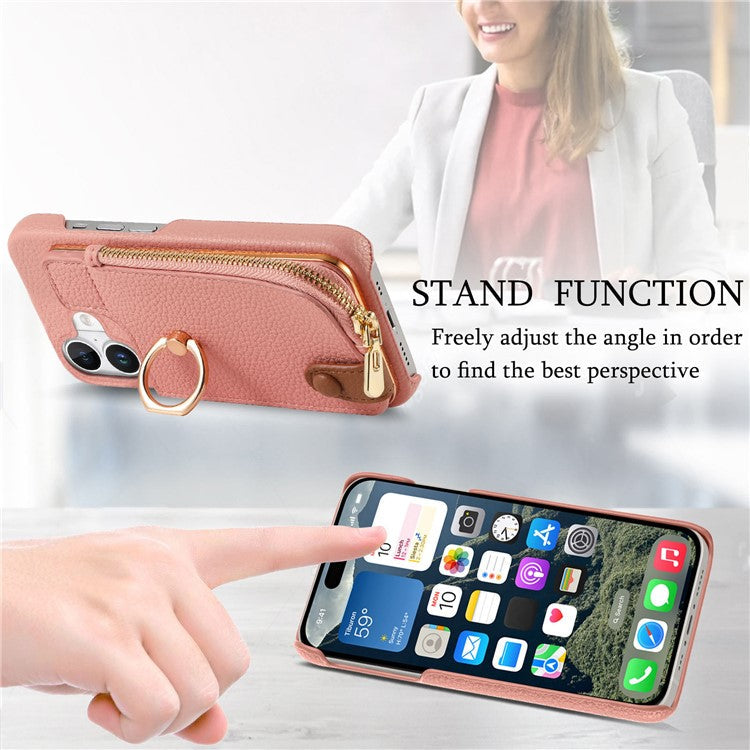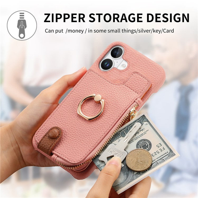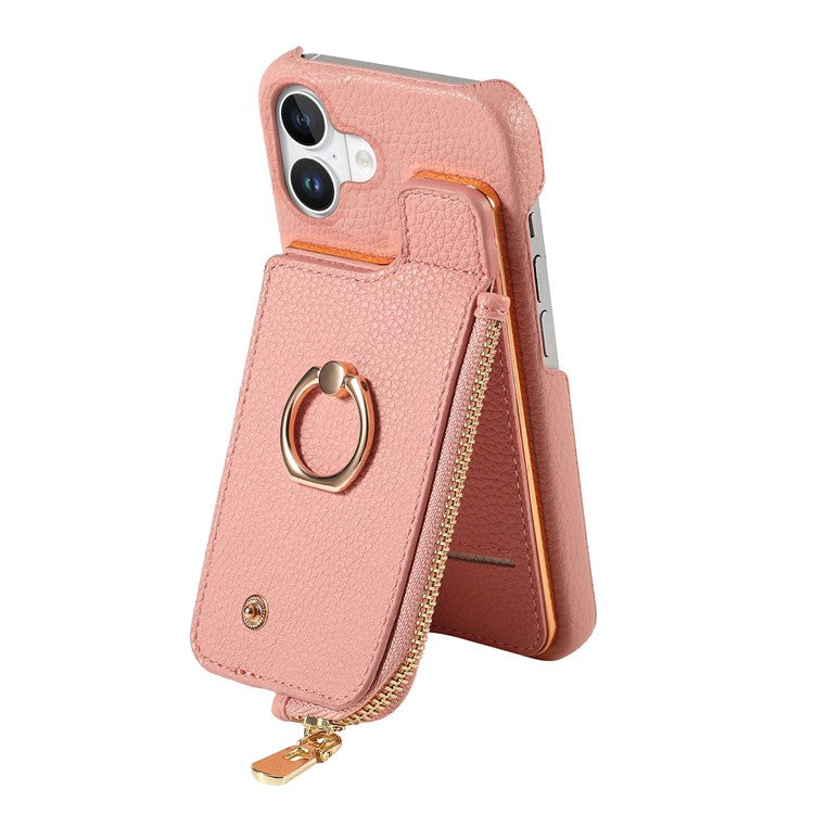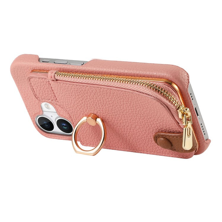 Y3 For iPhone 16 Case Card Holder Kickstand Leather+TPU Phone Cover with Zipper Pocket - Pink