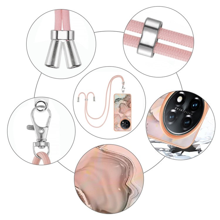 YB IMD Series-18 Style E for OnePlus 11 5G Flexible TPU Case Marble Pattern 2.0mm Electroplating Phone Cover with Lanyard - Pink