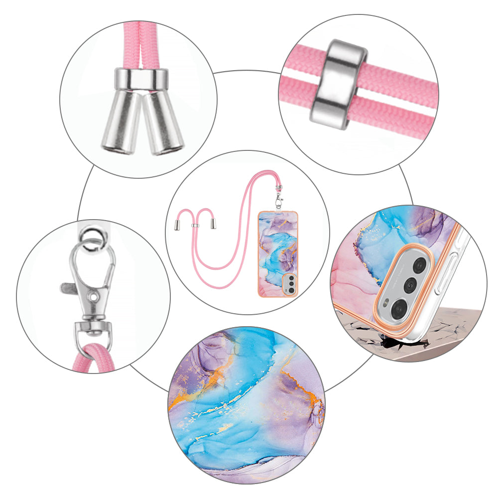 YB IMD Series-4 TPU Phone Case for Motorola Moto E32 4G , Electroplated Marble Flower Pattern IMD Cover with Lanyard - Milky Way Marble Blue