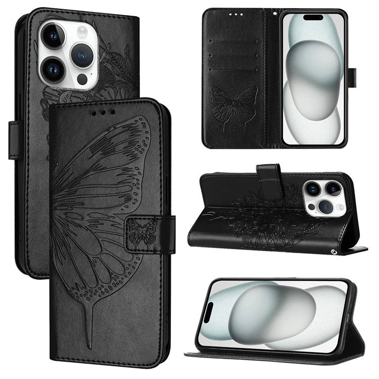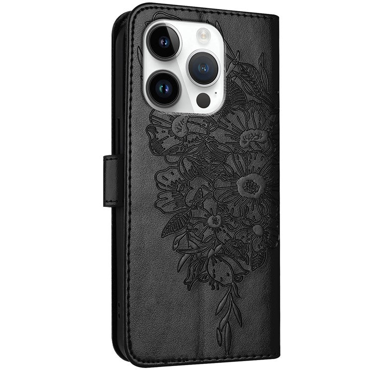 YB Imprinting Series-4 For iPhone 16 Pro Case Butterfly Flower Flip Wallet Leather Phone Cover - Black