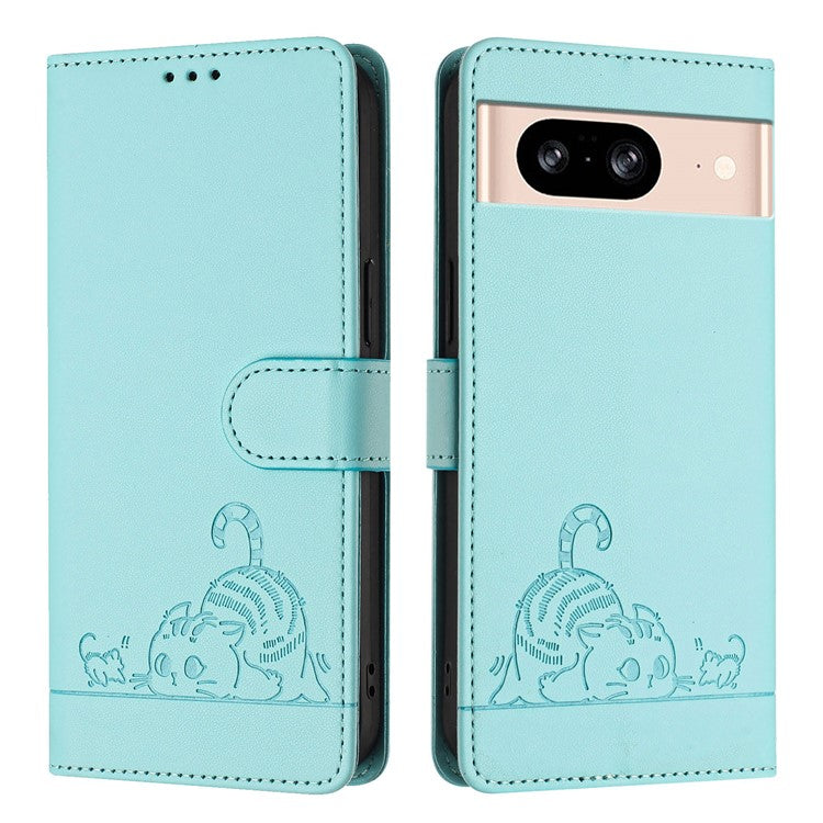 YB Imprinting Series-9 for Google Pixel 8 Case Cat Mouse Pattern Leather Wallet Stand Phone Cover - Mint Green