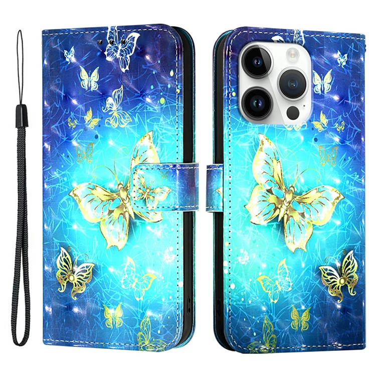 YB Pattern Printing Leather Series-2 For iPhone 16 Pro Case Stand View Wallet Phone Cover - Golden Butterflies