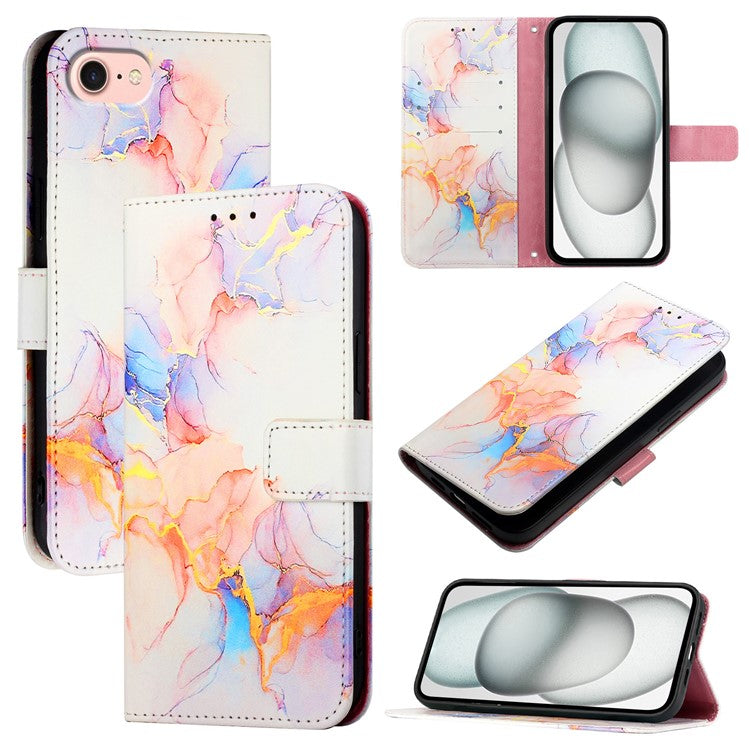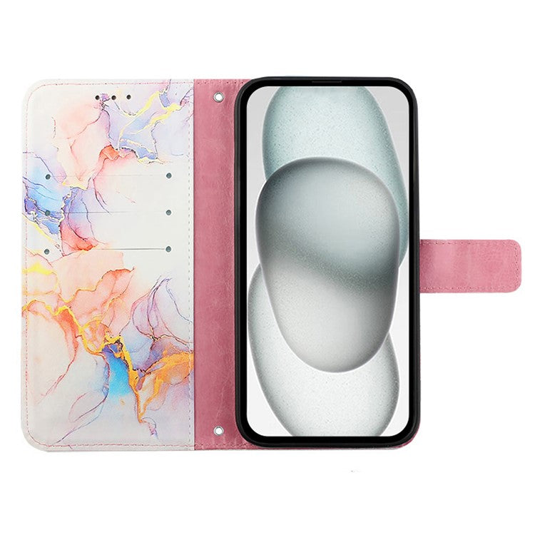 YB Pattern Printing Leather Series-5 For iPhone 16e Wallet Case Leather Phone Cover with Strap - Milky Way Marble White LS004