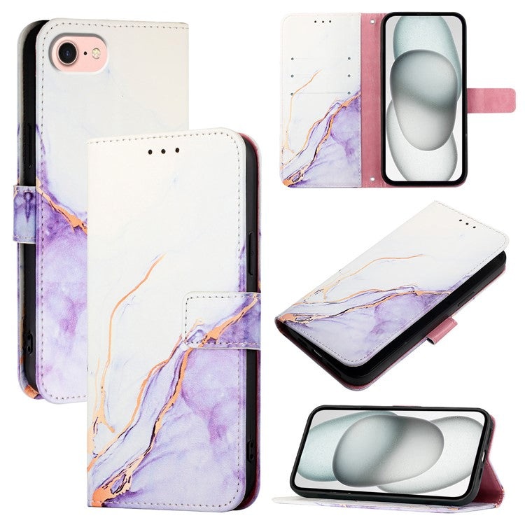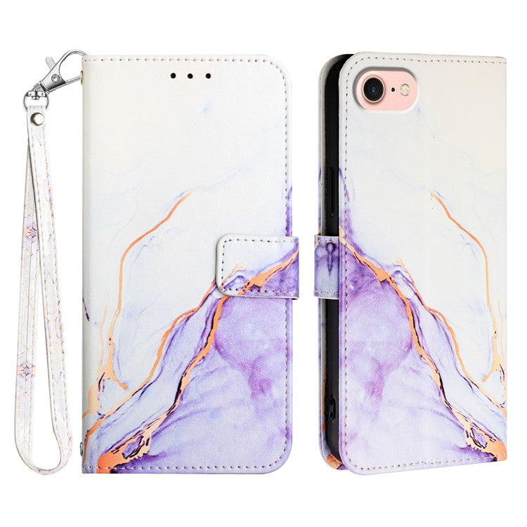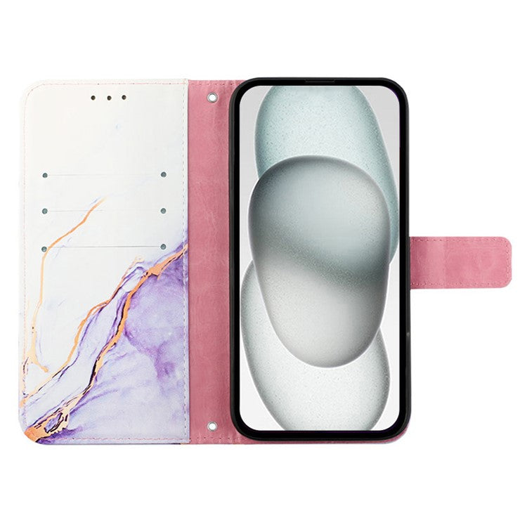 YB Pattern Printing Leather Series-5 For iPhone 16e Wallet Case Leather Phone Cover with Strap - White+Purple LS006