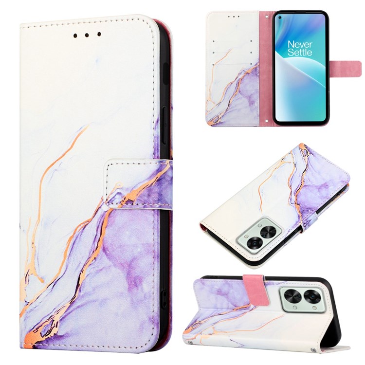 YB Pattern Printing Leather Series-5 for OnePlus Nord 2T 5G Marble Pattern Printing Handbag PU Leather Stand Function Wallet Flip Cover with Strap - White/Purple 006