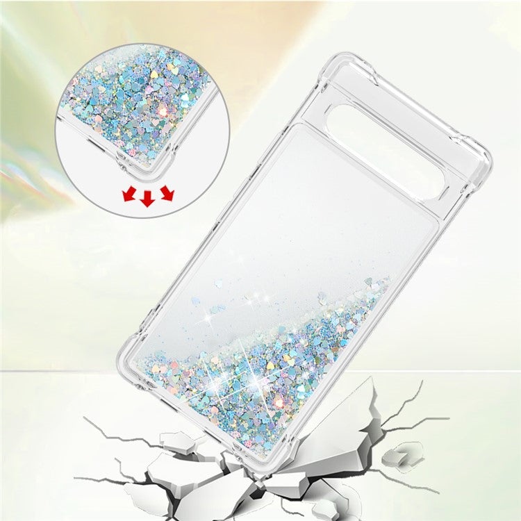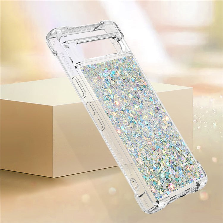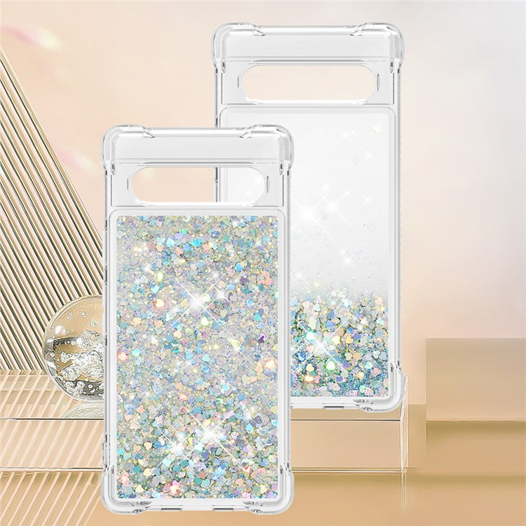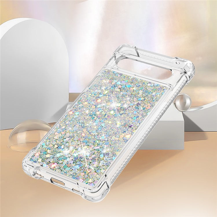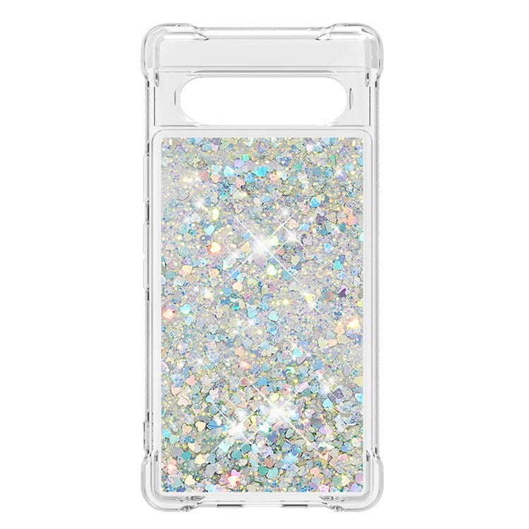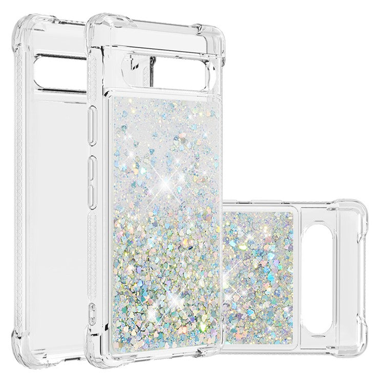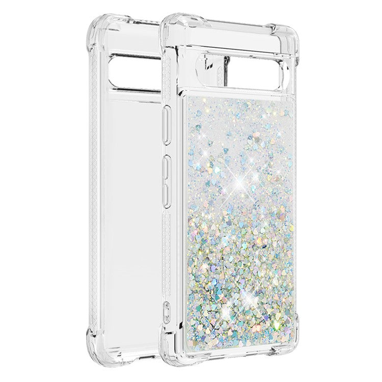 YB Quicksand Series-1 for Google Pixel 7a Quicksand Flowing Glitter Soft TPU Case Anti-scratch Cell Phone Cover - Silver / Hearts
