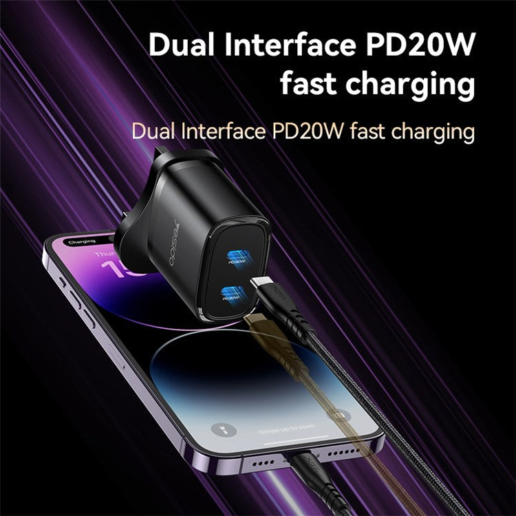 YESIDO YC53 20W UK Plug Charging Adapter Wall Charger with Type-C to iP Cable - Black