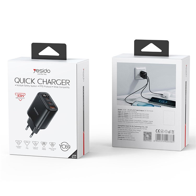 YESIDO YC69 Digital Display 30W Wall Charger 2 Type-C + 1 USB-A Phone Charging Adapter, EU Plug