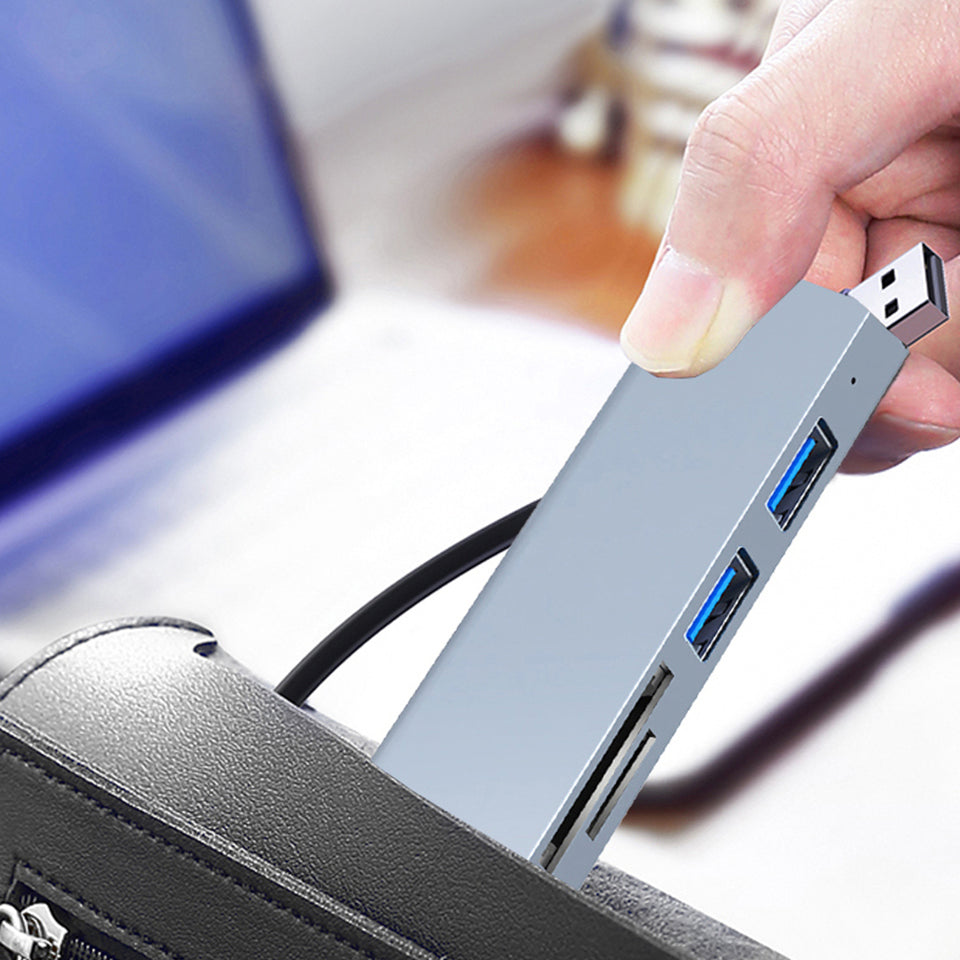 5 in1 docking station: 1 x standard USB3.0 port with a transmission speed of 5Gbps; 2 x USB2.0 ports with a transmission speed of 480 Mbps; ensuring fast synchronization and file-sharing; 2 TF card slots for excellent data storage versatility